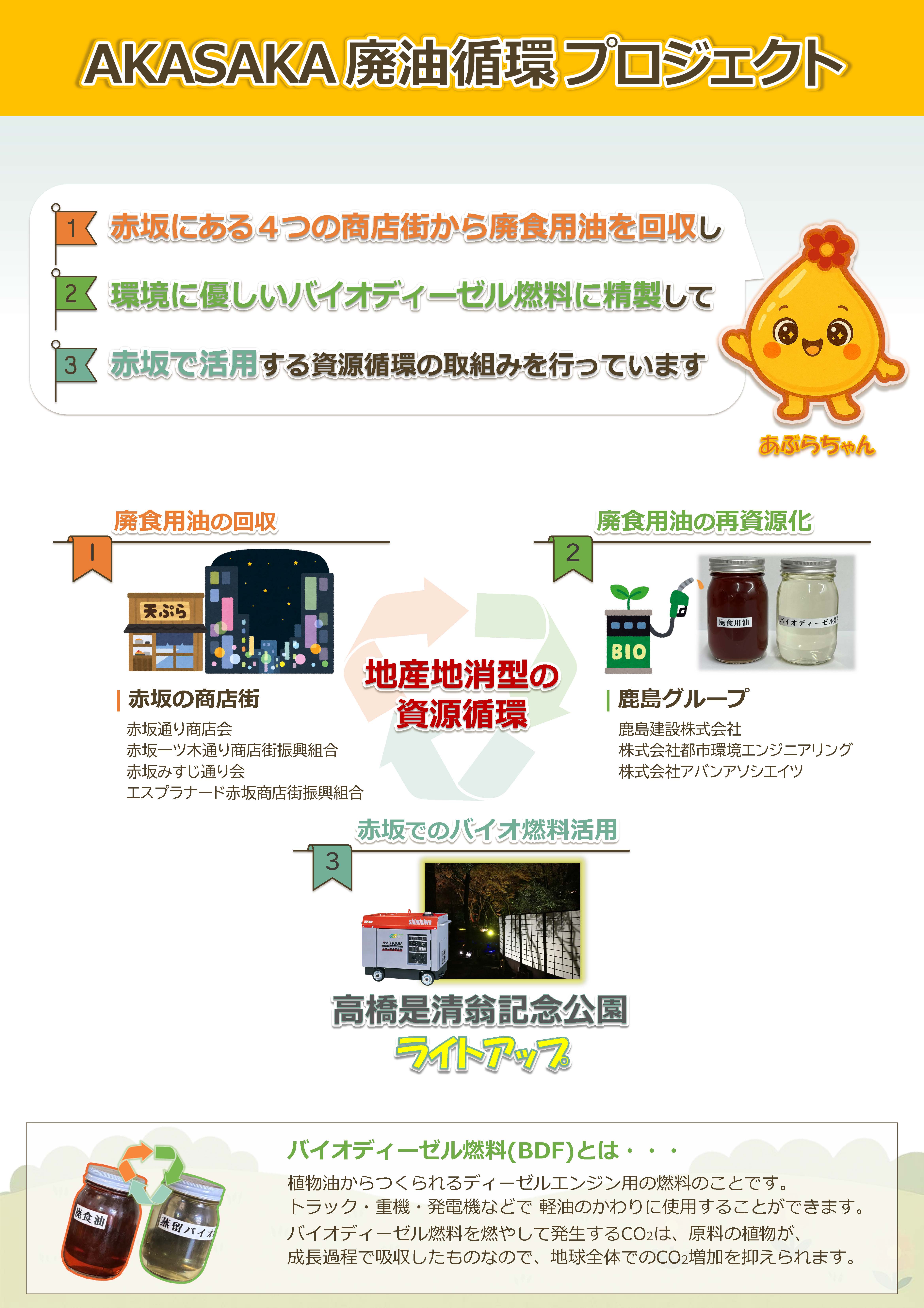 当社は東京都港区赤坂の商店街から廃食用油を回収、バイオディーゼル燃料に再生し、11月27日~30日、港区 高橋是清翁記念公園のライトアップイベントで発電に活用しました。地域とともに進める「AKASAKA廃油循環プロジェクト」の第一歩として、地産地消の資源循環を実現しました。今後も当社は本プロジェクトを継続し、地域と共に循環型社会の構築を目指してまいります。
